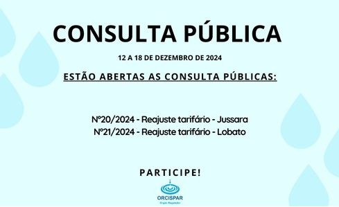 Estão abertas as Consultas Públicas 20 e 21/2024 sobre os pareceres técnicos de reajustes tarifários dos municípios de Jussara e Lobato.