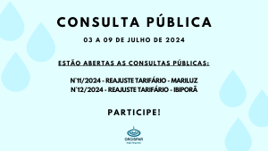 Estão abertas as Consultas Públicas nº 11 e 12/2024 sobre os pareceres técnicos de reajustes tarifários dos municípios de Mariluz e Ibiporã.